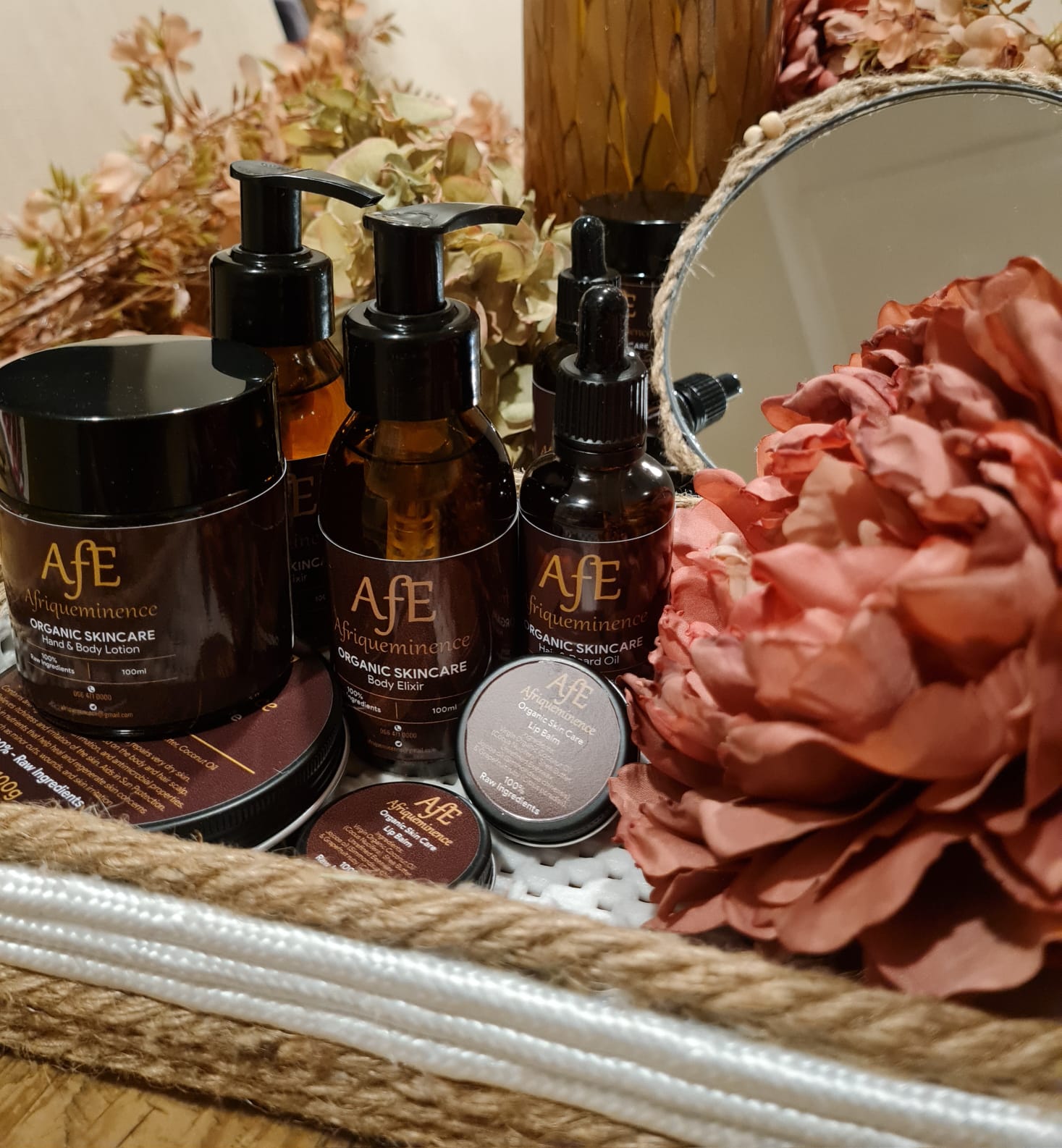 The Afriqueminence organic skincare range consists of our best-selling Body Elixir (body oil) in a 100ml quantity bottle, Lip balm in a 15g tin, Hand and Body lotion in a 100ml container, Hair and Beard Oil in a 50ml bottle, and a Body butter that also doubles as a hair food, in a 100g container. All our skincare products are from essential oils, that are mixed with carrier oils to aid absorption to the skin and to prevent irritation of the skin.